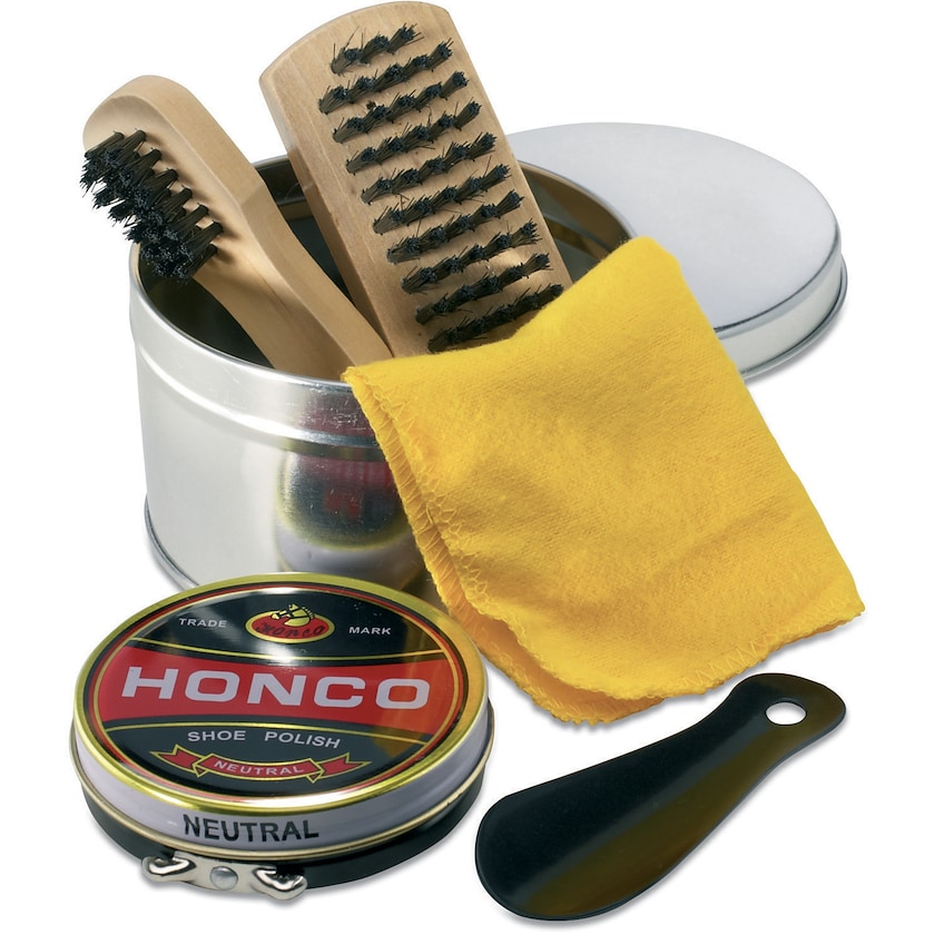 Tyylikäs viiden osan kenkienhoitosetti. Sisältää kenkävoiteen, kaksi kenkäharjaa, puhdistusliinan ja kenkälusikan.