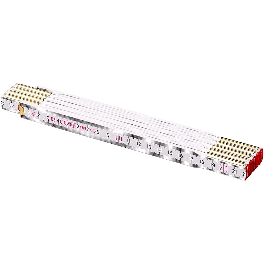 Kahden metrin nivelmitta ammattilaiskäyttöön. Mittakeppi on valmistettu pyökistä, ja siinä on vahvistetut teräsnivelet, jotka eivät näy ulkopuolelle. Puu on maalattu kahteen kertaan ja maalin päällä on suojaava kerros. Mitta on valmistettu ja painettu EU:ssa, ja se täyttää vaatimukset seuraaviin sertifikaatteihin: EC type-examination certificate, EC-accuracy class III & EC conform.