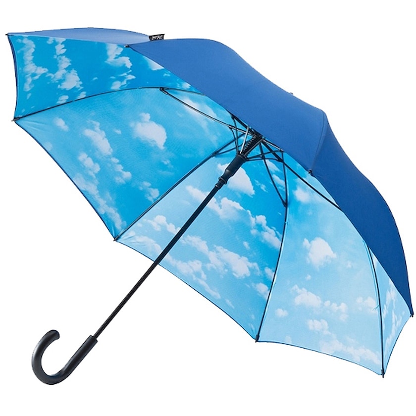 Iso, korkealaatuinen sateenvarjo, jossa on sisäpuolella pilvikuvio. Lasikuituinen sateenvarjo on erittäin vakaa. Kädensijassa kumipäällyste.