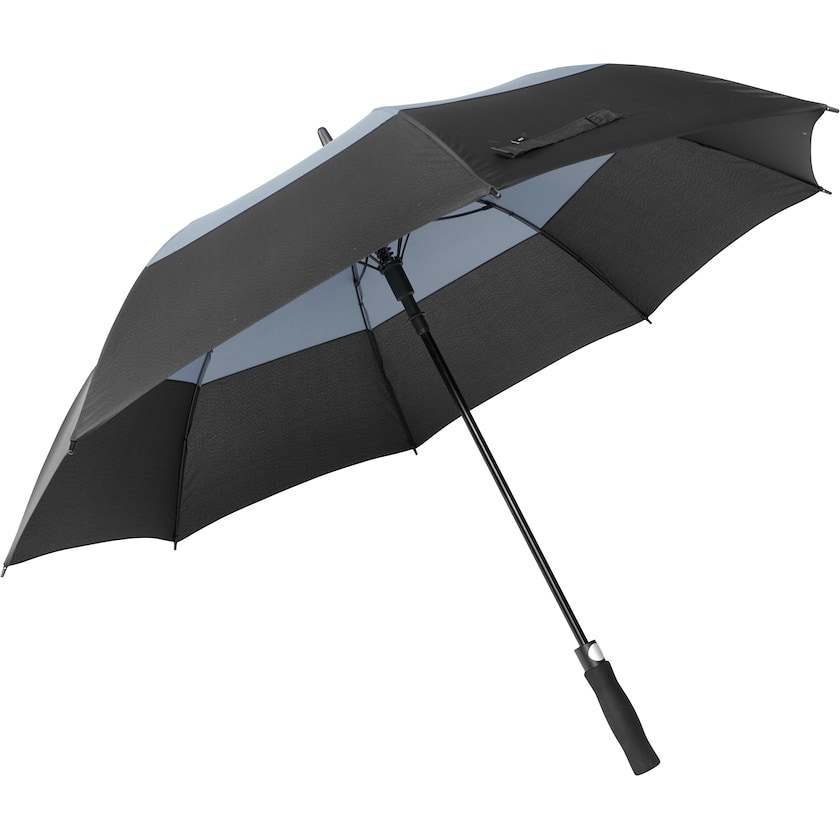Iso golfsateenvarjo, joka on valmistettu ympäristöystävällisestä materiaalista. Kangas on valmistettu rPET:stä eli kierrätetyistä PET-pulloista. Rimat ja tanko ovat valmistettu lasikuidusta. Kahva on pehmeää vaahtomuovia.