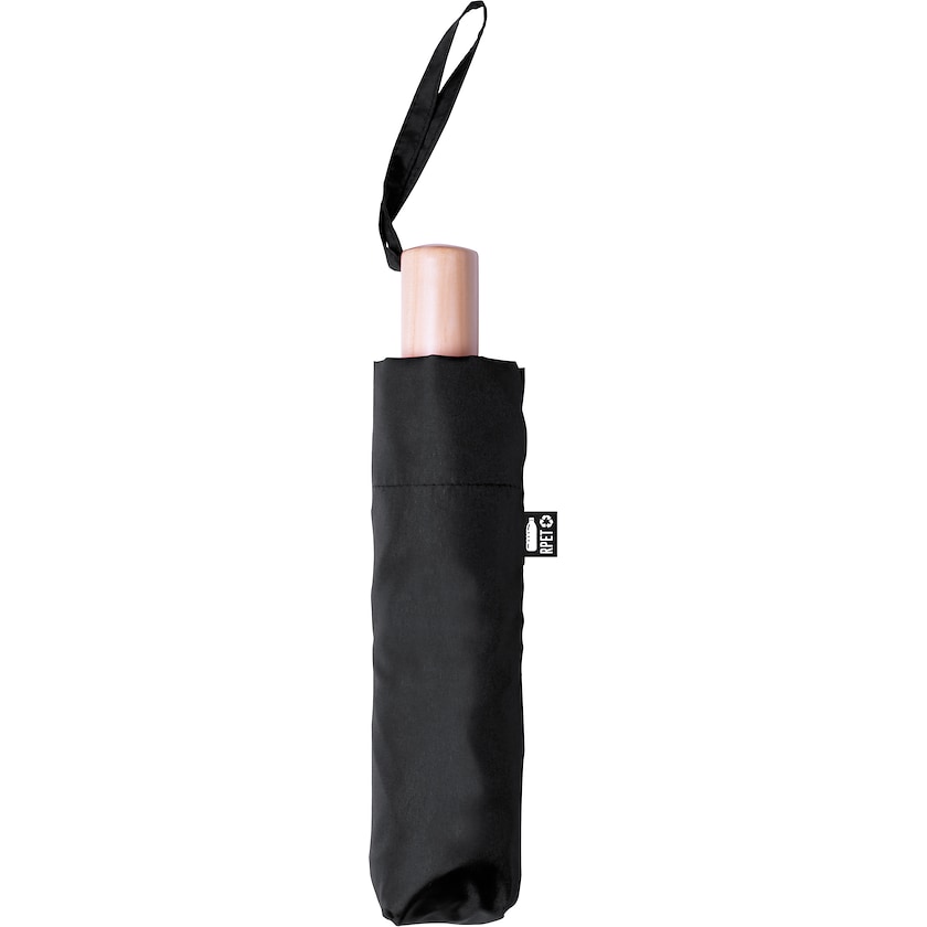 Ympäristöystävällinen myrskynkestävä sateenvarjo kompaktissa muodossa. Sateenvarjossa on metallirunko, lasikuiturimat ja puinen kahva. Kangas on valmistettu ympäristöystävällisestä rPET-materiaalista.