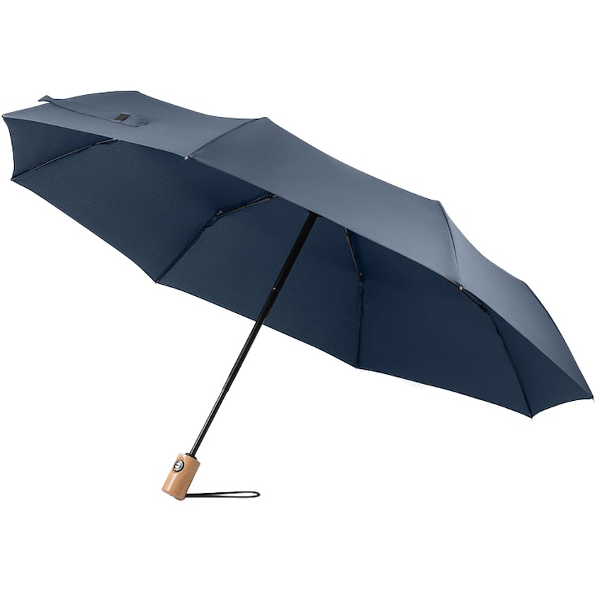 Ympäristöystävällinen kokoontaitettava sateenvarjo painatuksella. Kangas on valmistettu rPET:stä eli kierrätetyistä PET-pulloista. Rimat on valmistettu lasikuidusta ja kahva puusta. Automaattinen avaus- ja sulkumekanismi.