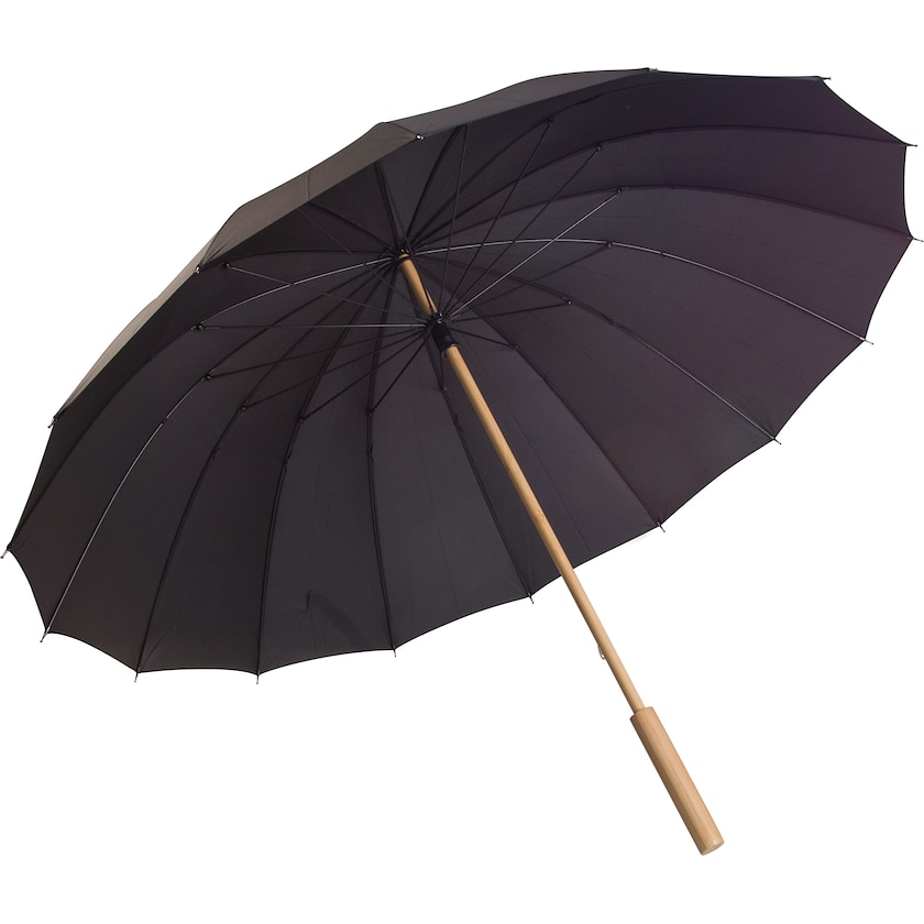 Ympäristöystävällinen myrskysateenvarjo bambuyksityiskohdilla. Kangas on valmistettu rPET:stä eli kierrätetyistä PET-pulloista. Sateenvarjon tanko ja kahva ovat bambua ja rimat lasikuitua. Sateenvarjo on varustettu tarralla, joka osoittaa, että kangas on valmistettu rPET:stä.