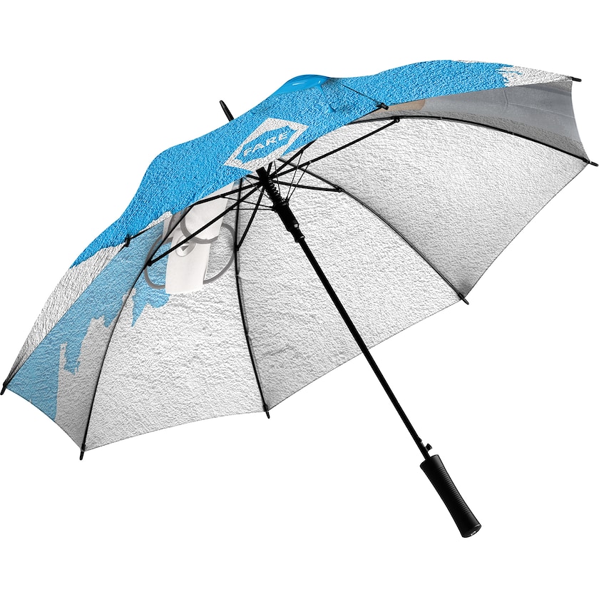 Laadukas sateenvarjo, jonka kankaaseen saa oman painatuksen. Sateenvarjossa on vahvistettu rakenne, joka pärjää kovassakin myrskytuulessa. Varjon tanko on galvanisoitua terästä ja rimat lasikuitua. Koko kankaan alalle saa digipainatuksen. Toimitusaika on pidempi kuin muissa sateenvarjoissa, koska tuotteet tehdään mittatilaustyönä tehtaalla.