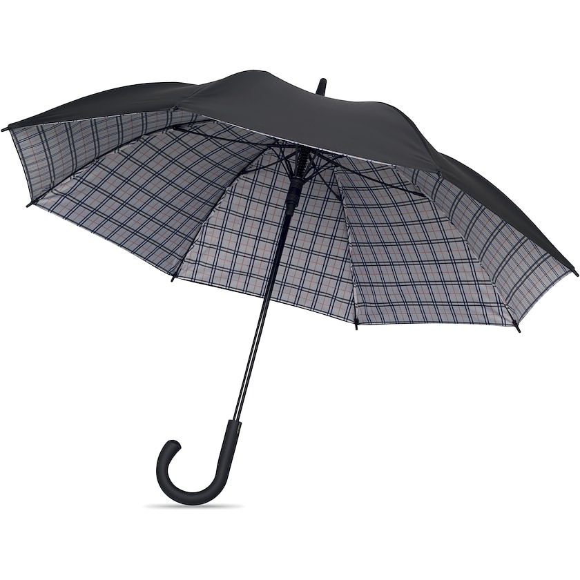 Myrskynkestävä sateenvarjo, jonka sisäpuolella on ruutukuosi. Varjossa on lasikuiturimat ja kumipäällysteinen kahva. Automaattinen avausmekanismi.