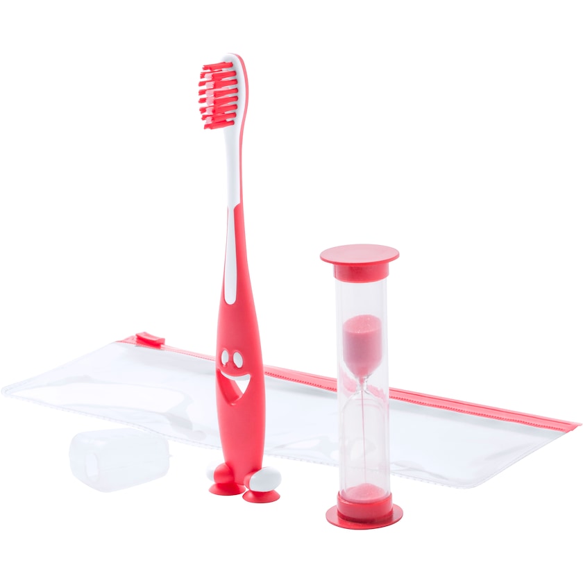 Hammasharja ja tiimalasi kirkkaan läpikuultavassa pussissa. Neljä värivaihtoehtoa. Pussissa zip lock -kiinnitys. Max. 3-värinen painatus tehdään pussiin.