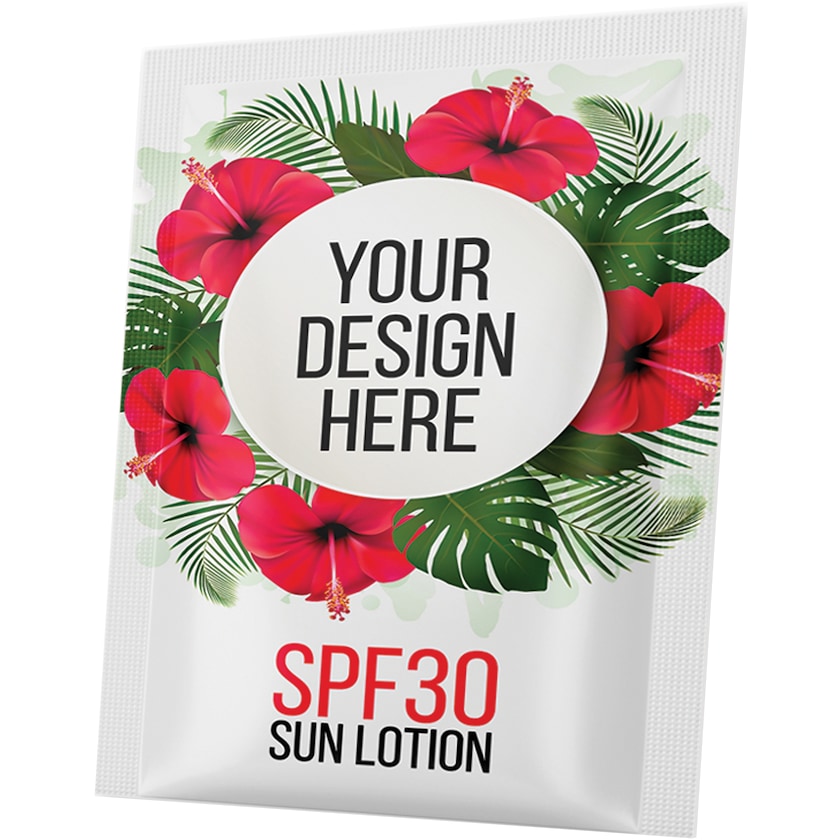 Aurinkorasva digipainatetussa pakkauksessa. Aurinkorasvan suojakerroin on SPF30, ja se suojaa sekä UVA- että UVB-säteiltä. Koko pakkaus painetaan toiveidesi mukaisesti. Pussi on saatavilla kiiltävänä ja mattapintaisena.