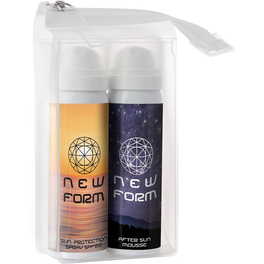 Setti, joka sisältää aurinkovoidesuihkeen sekä after sun -voiteen. Kumpikin pullo on tilavuudeltaan 50 ml. Aurinkosuihkeen suojakerroin on SPF30. Painatushinta sisältää kustomoidun etiketin molempiin pulloihin.