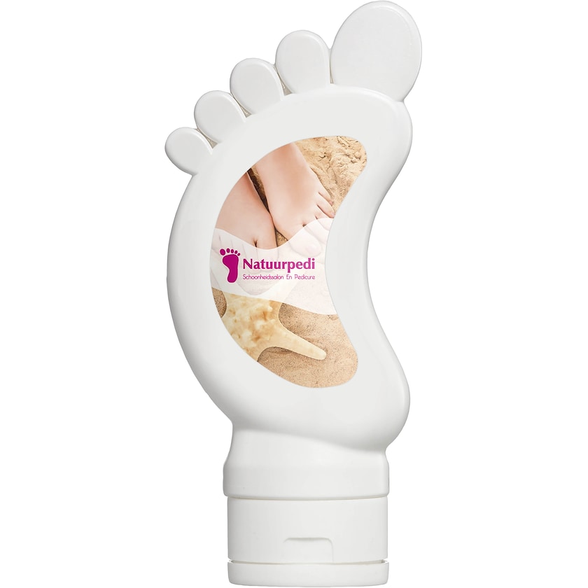 Hoitava jalkavoide hauskassa jalan muotoisessa muovituubissa. Mentolintuoksuinen jalkavoide viilentää ja kosteuttaa jalkojen ihoa. Voide on dermatologisesti testattu (ei eläinkokein) ja valmistettu Saksassa European Cosmetics Regulation 1223/2009/EG -säädösten mukaisesti. Tuubiin saa etiketin omalla painatuksella.