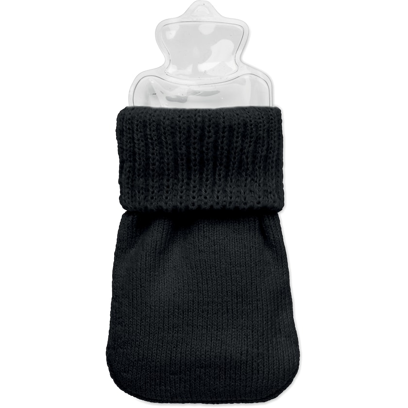 Lämpöpakkaus neulotussa pussissa. Lämpöpakkaus aktivoidaan painamalla sen sisäpuolella olevaa metallilevyä. Voidaan aktivoida uudelleen laittamalla se lämpimään veteen.