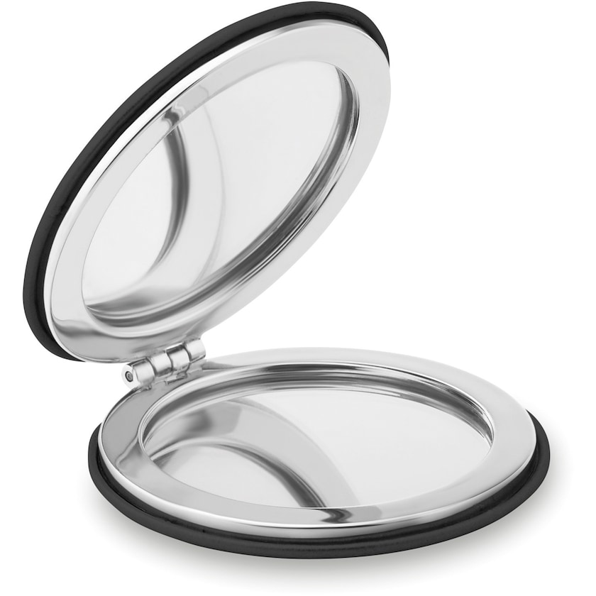 Pyöreä taskupeili, värivaihtoehtoina musta, valkoinen, punainen ja hopeanharmaa. Keinonahkainen pinta, sisällä kaksi peiliä. Tuotteeseen saatavana 1-4-värinen logo- tai tekstipainatus valitsemillasi Pantone-sävyillä.