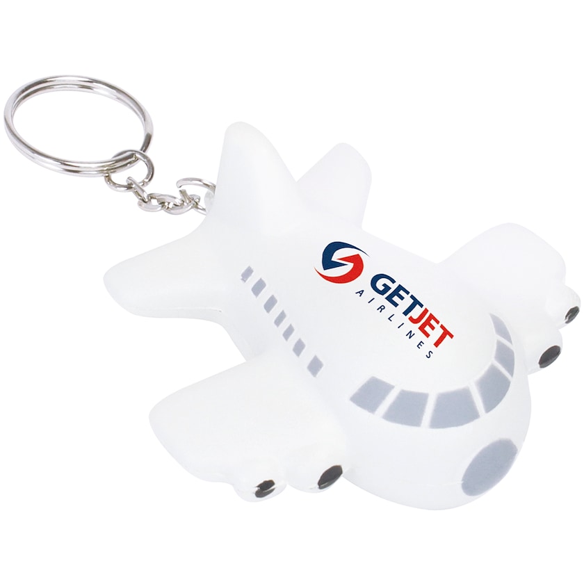 Lentokoneeksi suunniteltu stressipallo avaimenperässä. Täydellinen lentoyhtiöille. Painatus kestää pitkään puristelun.