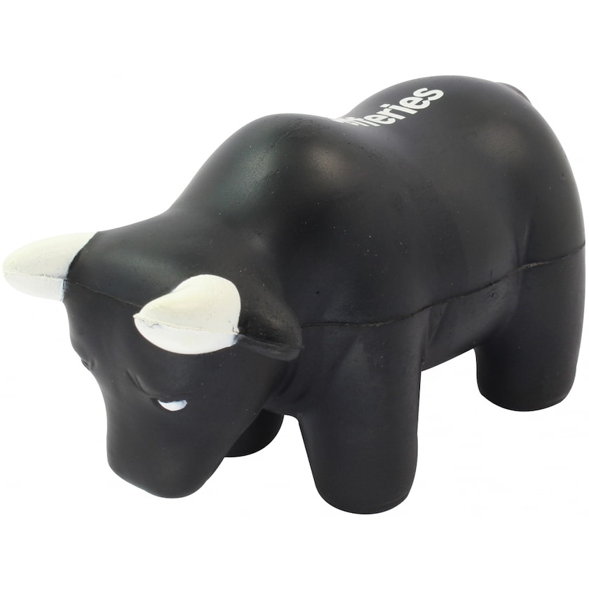 Musta härän muotoinen stressipallo. Uniikki stressipallo, joka huokuu voimaa. Painatus on erittäin korkealaatuinen ja pitkäkestoinen.