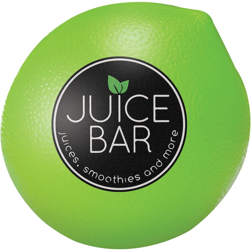 Limen muotoinen stressipallo painatuksella. Painatus säilyttää huippulaatunsa ja kestää pitkäaikaista puristelua.