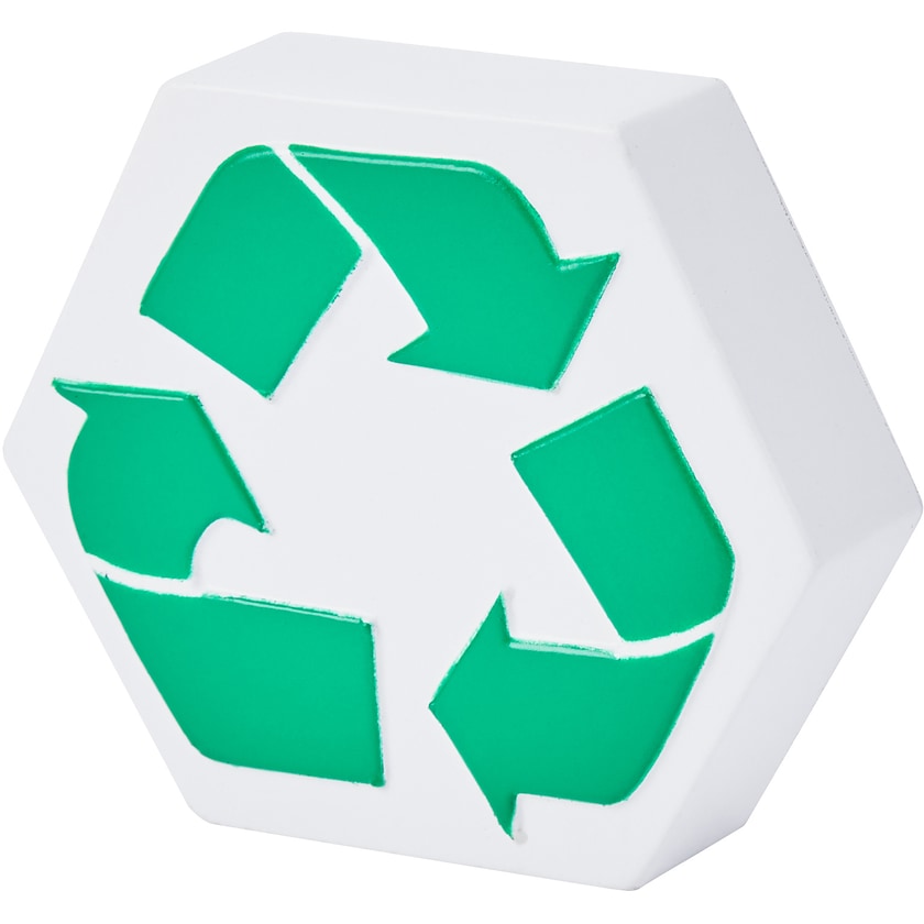 Kierrätyssymboli stressipallona. Tuotteen voi kustomoida laadukkaalla painatuksella, joka tehdään Pantone-väreillä.