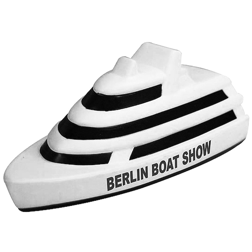 Superjahdin muotoinen stressipallo painatuksella. Painatuksen laatu on erittäin korkea. Stressipalloa voi siis puristella pitkään ilman, että painatus irtoaa.