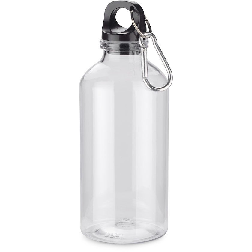 Kierrätetystä muovista valmistettu läpinäkyvä vesipullo. Alameda on kevyt ja varustettu karabiinihaalla, jotta se voidaan kiinnittää esimerkiksi reppuun.