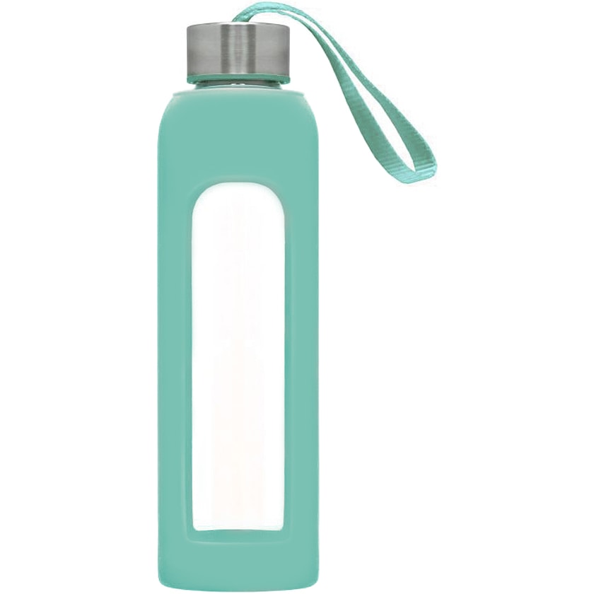 Kestävä borosilikaattilasinen vesipullo silikonsisuojuksella. Näyttävä ja käytännöllinen vesipullo on loistava liikelahja!