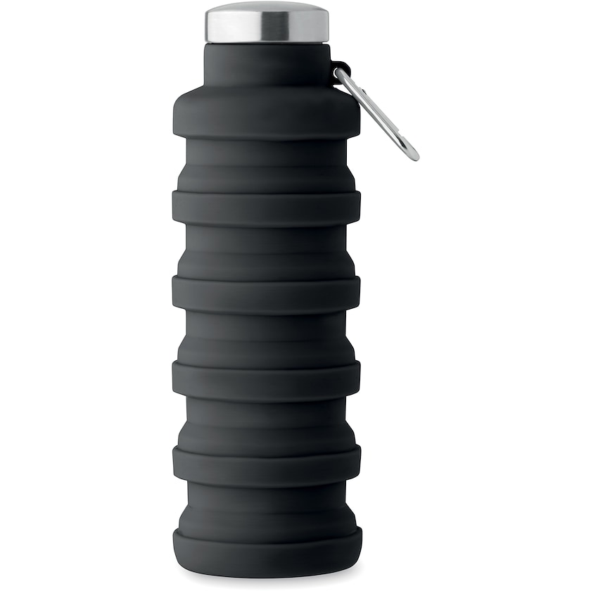 Kokoontaittuva silikoninen vesipullo. Kansi on ruostumatonta terästä ja karabiini alumiinia. Merkintä tehdään painatuksella tai laserkaiverruksella kanteen.