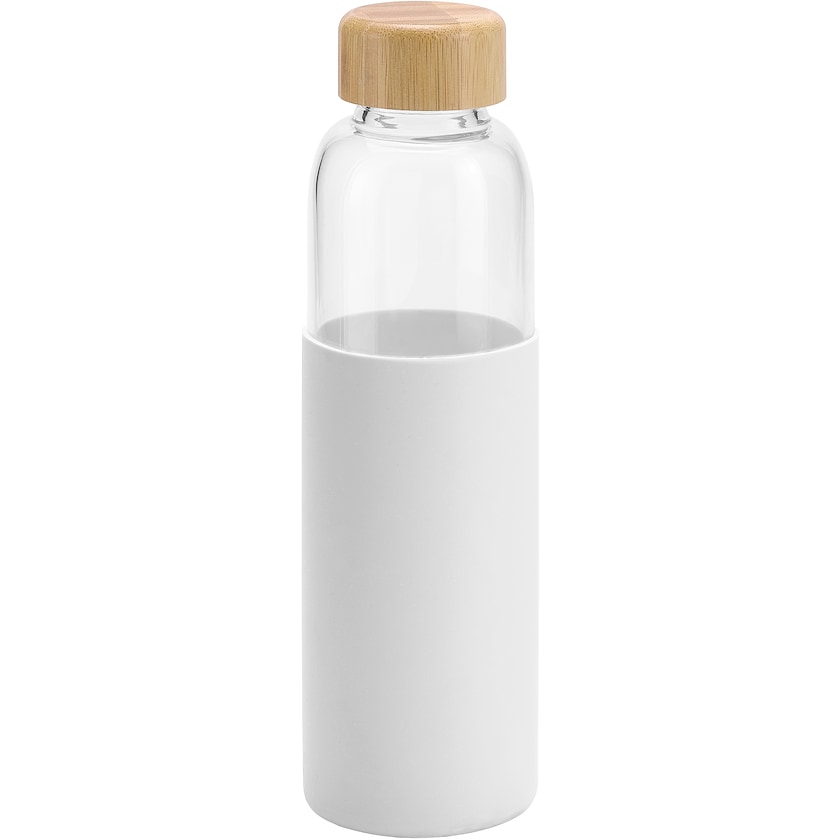 Lasinen vesipullo silikonisuojuksella. Pullon korkki on bambua. Vahva lasimateriaali on tulenkestävää. Pullot toimitetaan yksittäispakattuina pahvipakkauksissa. Tuotteeseen saa 1-väripainatuksen.