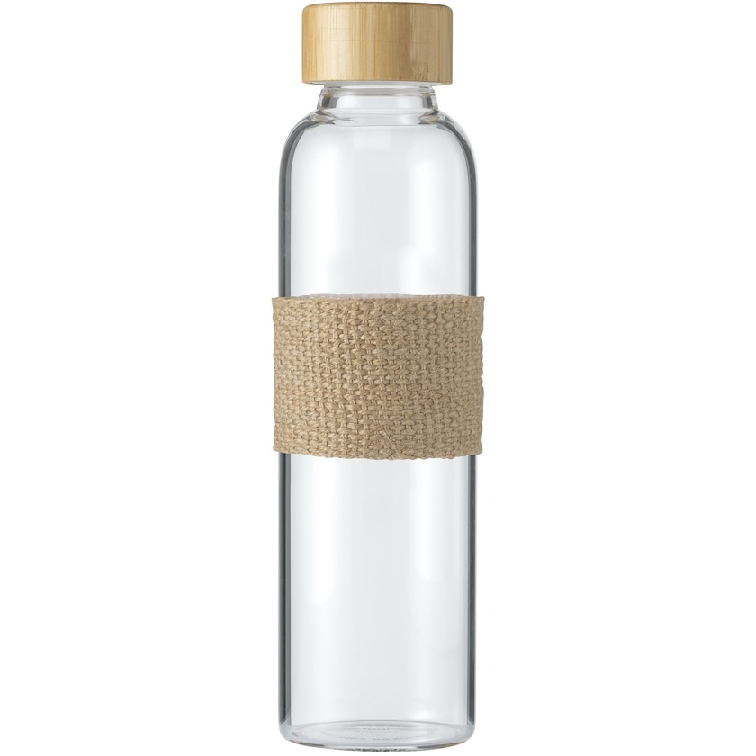 Vesipullo kestävästä borosilikaattilasista. Bambukorkilla varustettu pullo on täysin tiivis. Lasiosan voi pestä astianpesukoneessa. Tuotteet toimitetaan ruskeissa kartonkipakkauksissa. Painatus max. kahdella värillä.