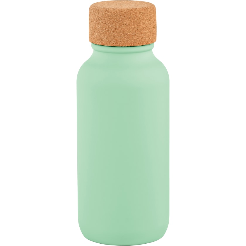 Kierrätetystä ruostumattomasta teräksestä valmistettu pullo. Pullon korkki on valmistettu korkista. Kestävä juomapullo, joka on ympäristöystävällinen valinta.