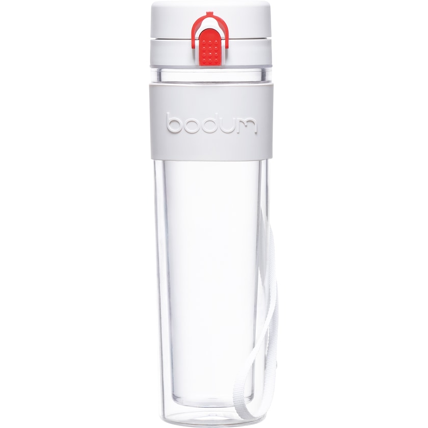 Bodum-vesipullo kaksinkertaisella rakenteella. Pullon eristyksen ansiosta kylmät juomat pysyvät viileinä pidempään. Pullon kannessa on lukitusnappi. Konepesun kestävän pullon voi kustomoida 1-väripainatuksella.
