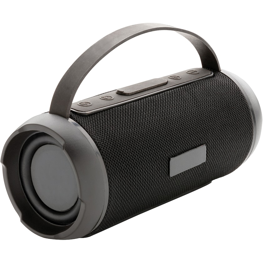 Vedenkestävä kaiutin vahvalla äänellä. Täydellinen ulkokäyttöön. Kantokahvan ansiosta helppo kantaa mukana mihin tahansa. Akun kesto noin kuusi tuntia. Painatus tulee edessä olevaan metallilaattaan.