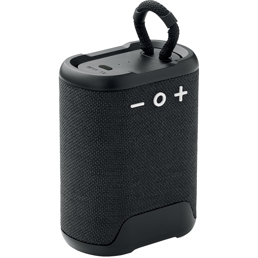 Vedenkestävä langaton kaiutin painatuksella. Kaiutin on valmistettu ABS:stä, ja sen kangas on 30% hamppua ja 70% polyesteriä. Soittoaika yhdellä latauksella: 8 tuntia. Laite on IPX7-vedenpitävä, eli sen voi ottaa mukaan uima-altaalle tai rannalle.