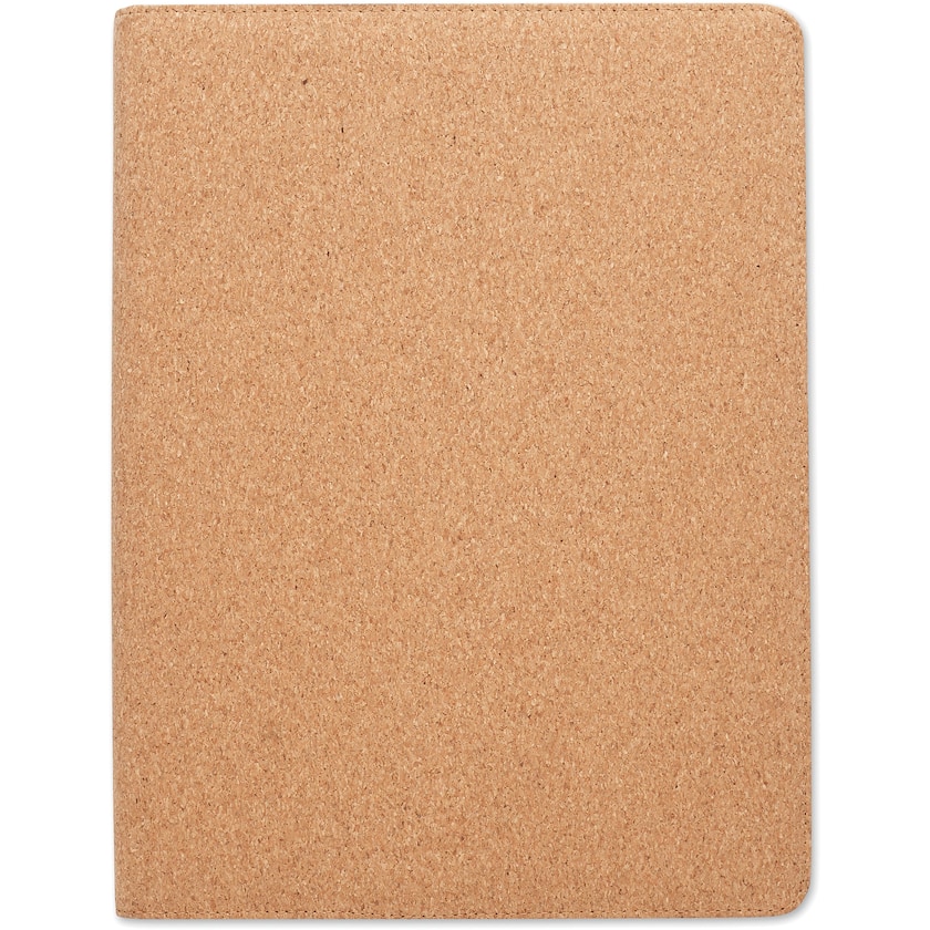 A4-kokoinen konferenssikansio, jonka kannet ovat aitoa korkkia. Sisällä on muistilehtiö, jossa on 30 viivoitettua sivua kierrätyspaperista. Mukana tulee yhteensopiva kynä.