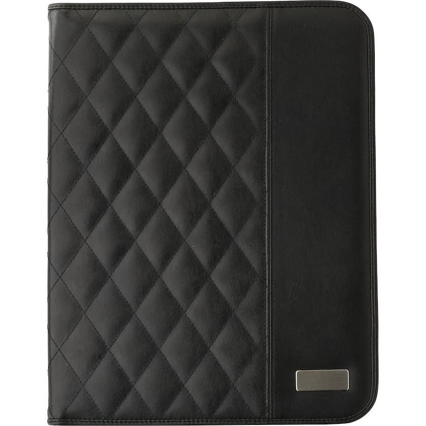 Ylellinen neuvottelukansio keinonahkapäällysteellä. Sisällä on kirjoitusalusta, jossa on 25 viivoitettua sivua sekä useita taskuja ja kynäpidikkeita. Merkintä tehdään laserkaiverruksella neuvottelukansion etupuolella olevaan metallilevyyn.