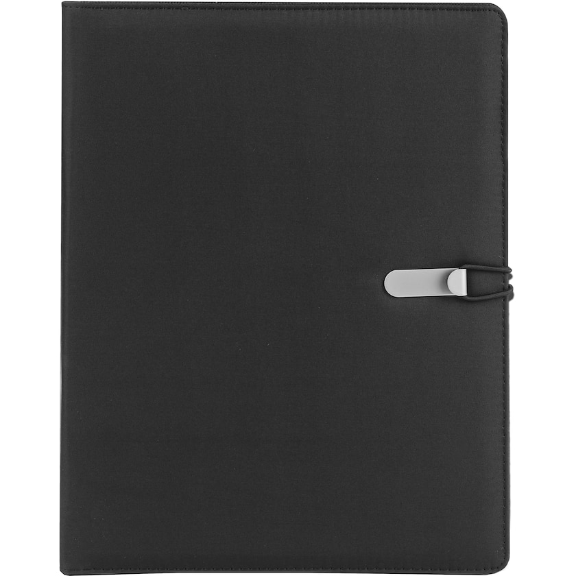 Moderni A4-kokoinen kokouskansio, jossa on yksi suuri ja kaksi pienempää taskua. Kansiossa on kaksi paikkaa muistitikuille, ja se sulkeutuu helposti lenkin ja kannessa olevan koukun avulla.