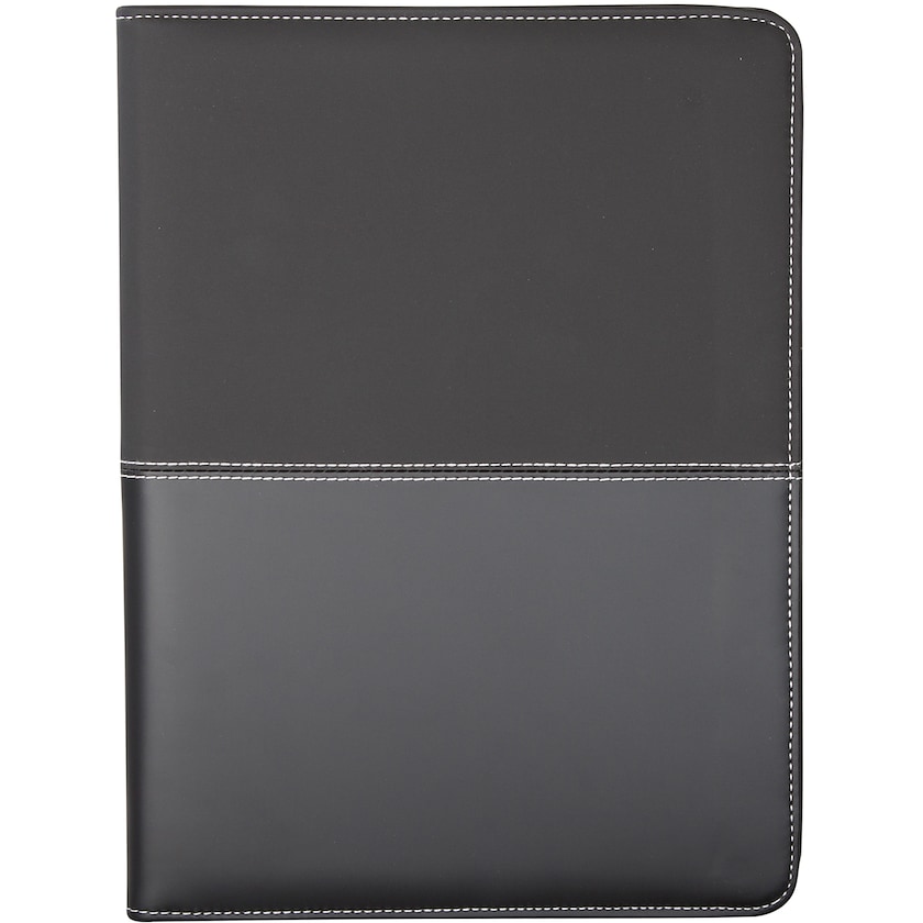 Tyylikäs kokouskansio kontrastivärisillä saumoilla. 20-sivuinen kirjoituslehtiö, kynäpidike ja käyntikorttitasku. Kansion voi sulkea vetoketjulla. Max 2-väripainatus.