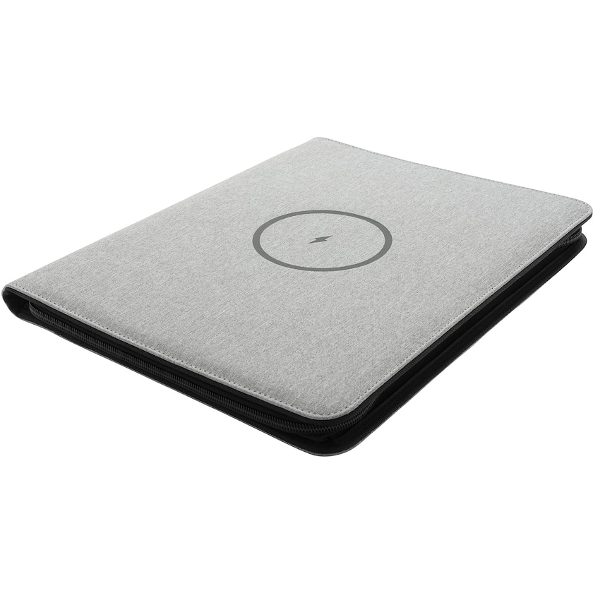 Kokouskansio, jonka kannessa on langaton varavirtalähde. Huippumoderni kansio sopii yrityksille, jotka haluavat uusinta uutta. Kansion sisällä on useita taskuja, sekä viivoitettu kirjoituslehtiö. Tuotteen materiaalina on polyuretaani sekä ympäristöystävällinen rPET. Input: 5.0V/2.1A., output 1: 5.0V/2.1A. Output 2: 5.0V/2.1A. Langaton output: 5W. Rekisteröity design®.