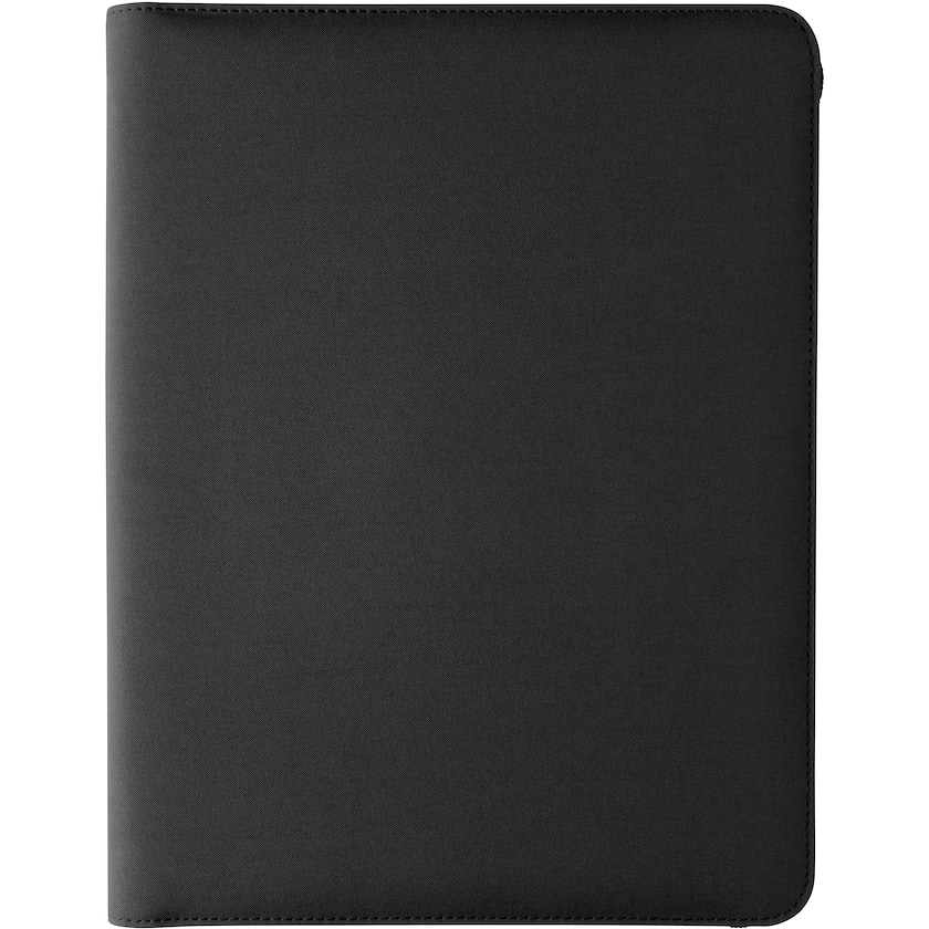 Kokouskansio kierrätyspolyesteristä. Kansion sisältä löytyy 20-sivuinen kirjoituslehtiö kierrätyspaperista, kuten myös kännykkätasku, käyntikorttitasku sekä muita näppäriä taskuja ja lokeroita. Kansio suljetaan vetoketjulla.