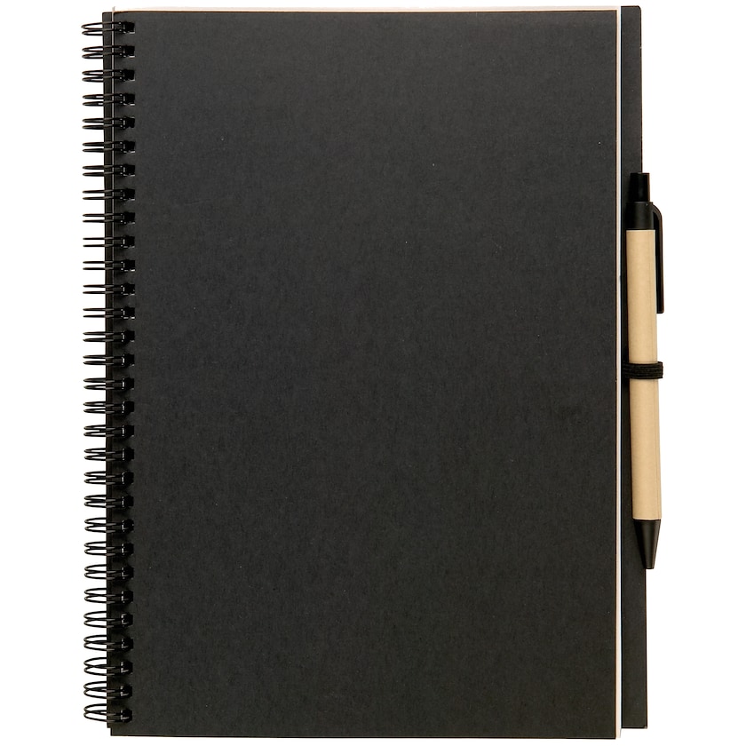 Ympäristöystävällinen kierrevihko kynällä. Muistikirjan sisällä on 70 kierrätyspaperista valmistettua viivoittamatonta sivua. Kynä on valmistettu biohajoavasta kierrätysmateriaalista.