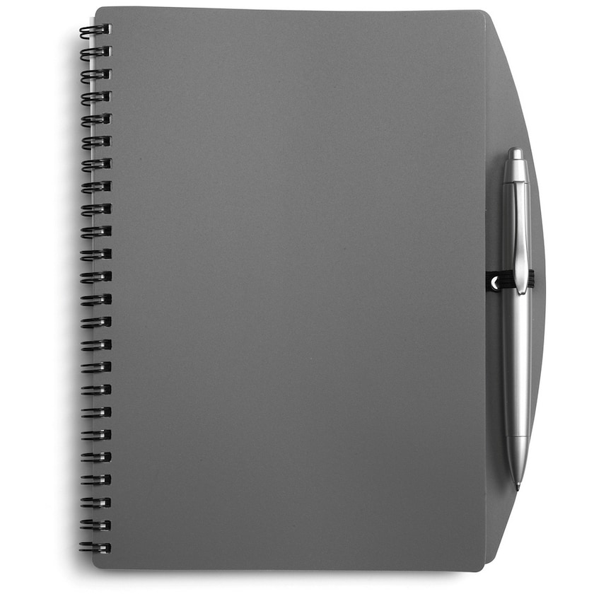 A5-kokoinen kierrevihko himmeällä kannella. Mukana kynä.