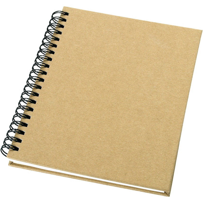 Ympäristöystävällinen A6-kierrelehtiö kierrätyspaperista. Kierrätyssymboli takakannessa ja jokaisella sivulla.