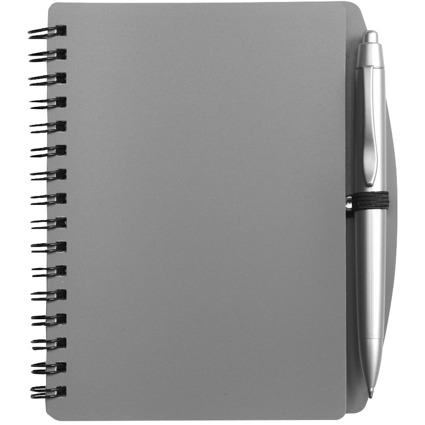 A6-kokoinen muistikirja huurretuilla kansilla ja mukana tulevalla kynällä.