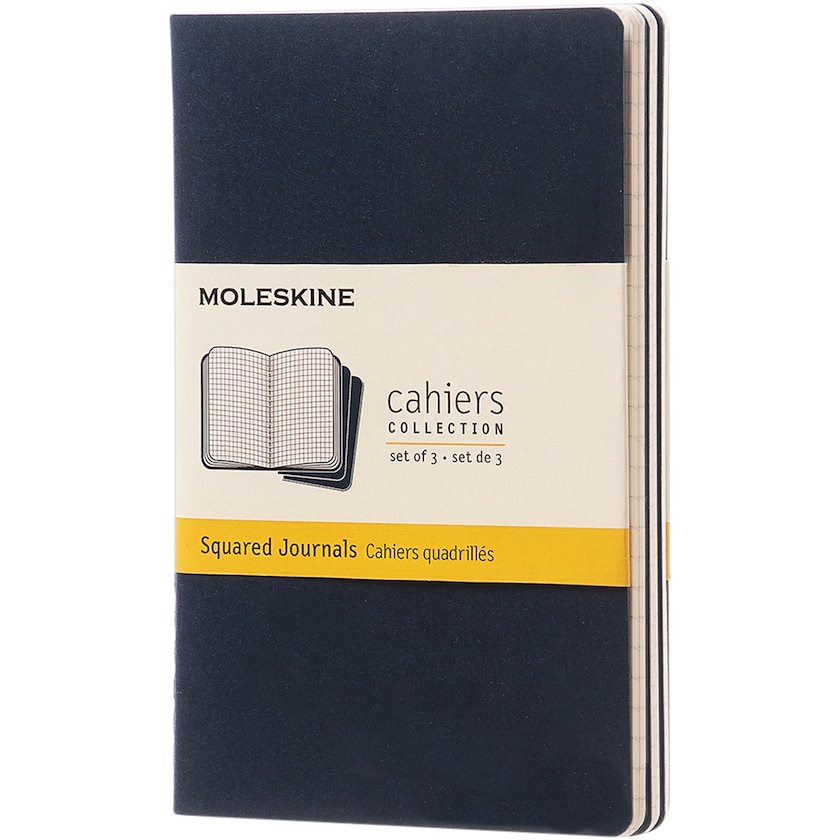 Ruutuvihko merkiltä Moleskine. Vihkossa on kartonkikannet, joiden sauma on näkyvissä vihkon selässä. Kermanvalkoiset sivut ovat ruudullisia ja viimeiset 16 sivua ovat irroitettavia. Vain 1-väripainatus.
