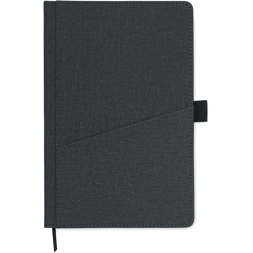 Muistikirja, jonka kannessa on tasku kännykälle. Sisältää 80 viivoitettua sivua kierrätyspaperista.