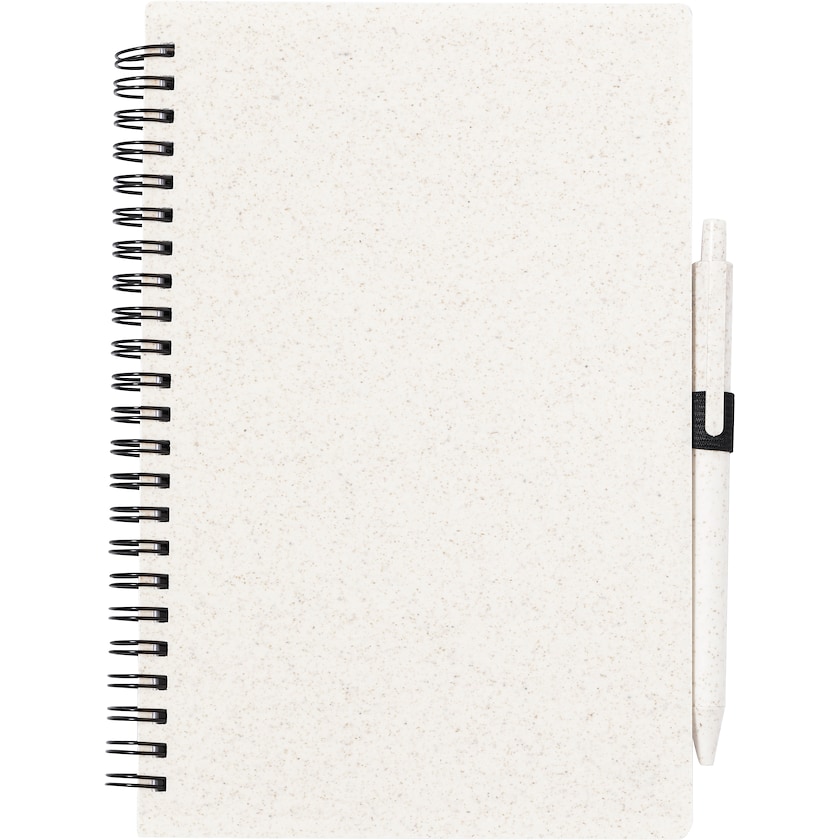 Ympäristöystävällinen kierremuistivihko kynällä. Kansi on valmistettu luomuvehnän oljesta ja sisältö koostuu 80 viivoitetusta kierrätyspapersivusta. Myös kynä on valmistettu vehnän oljesta.