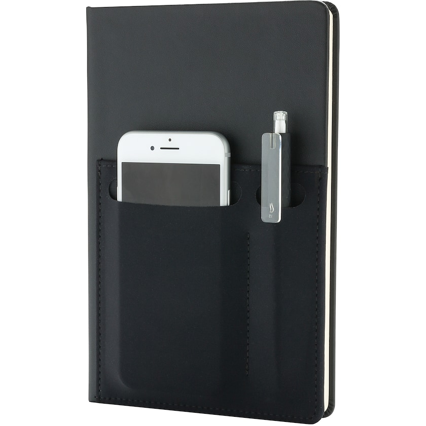 A5-kokoinen muistikirja, jossa on kolme taskua kannessa. Vihkossa on joustava kännykkätasku, kynätasku sekä dokumenttitasku. 8 cm leveään kännykkätaskuun mahtuu esimerkiksi iPhone 7 Plus. 80 viivoitettua kermanvalkoista sivua.