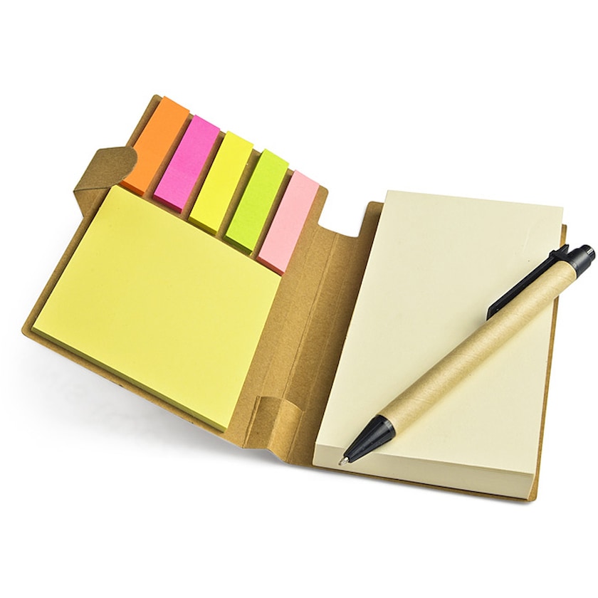 Muistikirja, jossa kynä, teippimerkkejä ja itsestäänliimaantuvat muistilaput. Kynä on valmistettu kierrätetyistä muovista ja kierrätetystä paperista. Tilaa ympäristöystävälliset muistikirjat kynällä Axon Profililta!