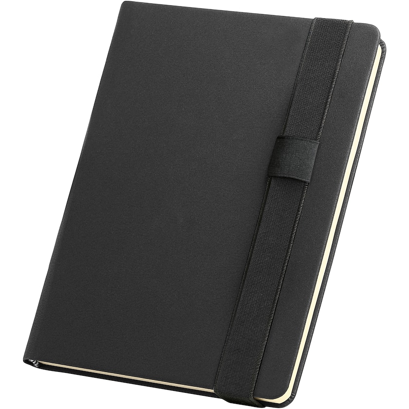 A5-kokoinen muistikirja, jonka kansi on keinonahkaa. Sisältää kynäpidikkeen ja 140 kermanvalkoista sivua. Kynä ei kuulu hintaan.