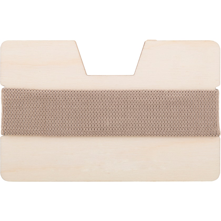 Maksukorttikotelo, jonka materiaalina on puu. Persoonallinen valinta! Vaalea kuminauha pitää kortit paikoillaan.