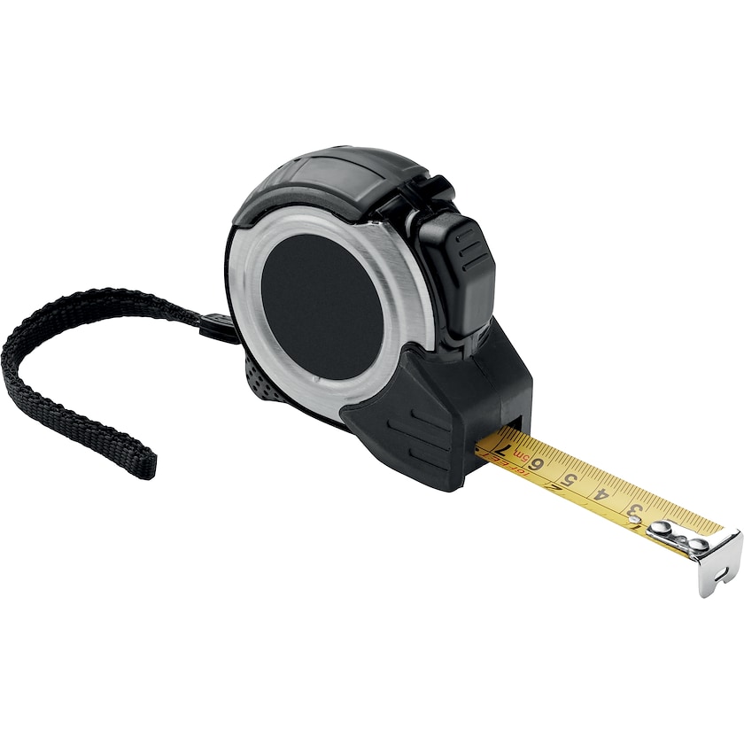 Jämäkkä ja laadukas rullamitta. Mitassa on iskunkestävä rakenne, kumiset yksityiskohdat ja automaattinen stop-toiminto. Painatus tehdään digipainatuksena suojaavan epoksipinnan alle.
