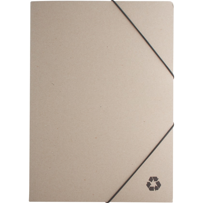 Ympäristöystävällinen paperikansio kierrätetystä pahvista. Oikeaan alakulmaan on painettu pieni kierrätyssymboli.