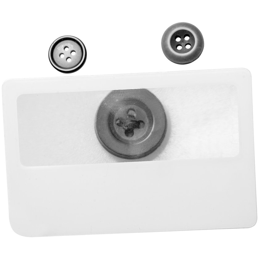 Edullinen suurennuslasi, joka on luottokortin kokoinen. Suurennuslasi mahtuu erinomaisesti kukkaroon tai lompakkoon.