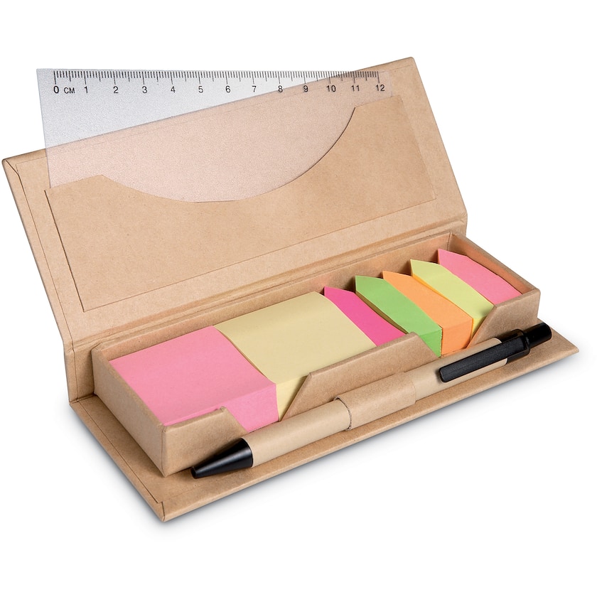 Teippimerkkisetti, jossa 2 eriväristä muistilappulehtiötä ja teippimerkkejä 5 eri värissä. Settiin sisältyvät myös läpinäkyvä, 12 cm:n viivain ja pahvinen kuulakärkikynä.